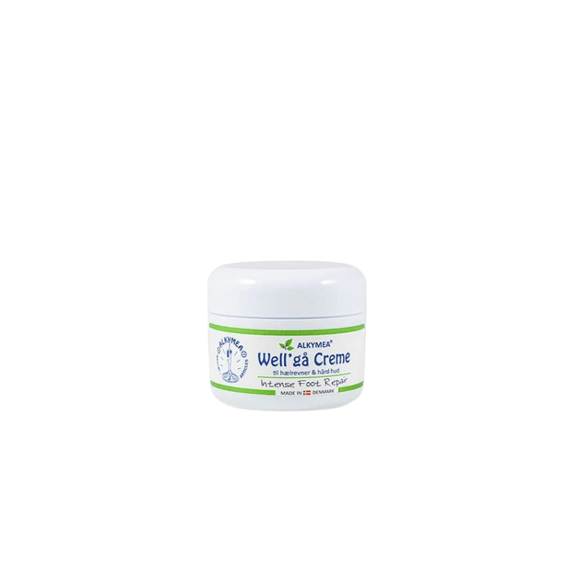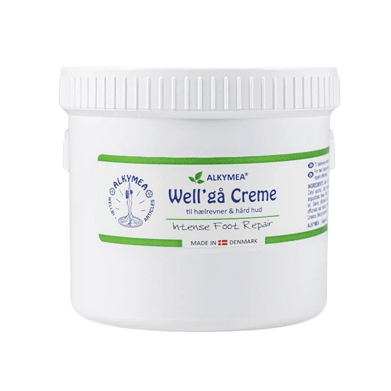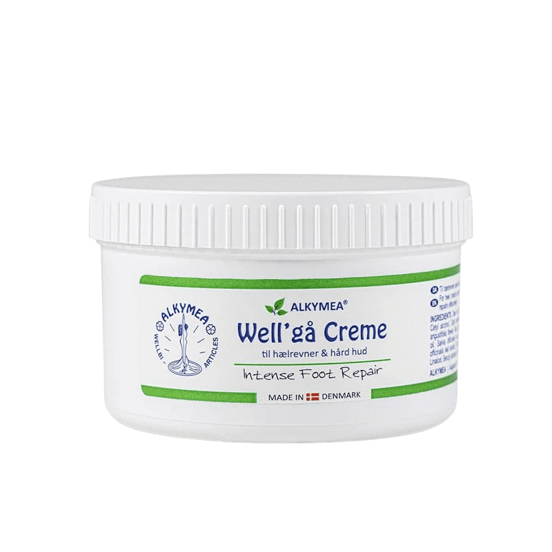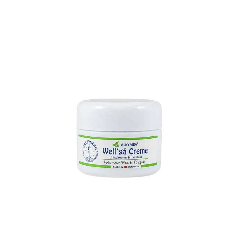 Well'gå is een stevige zalf met kamille en olijfolie, speciaal voor barstjes in de hiel, en harde en droge huid op voeten, ellebogen en nagelriemen.