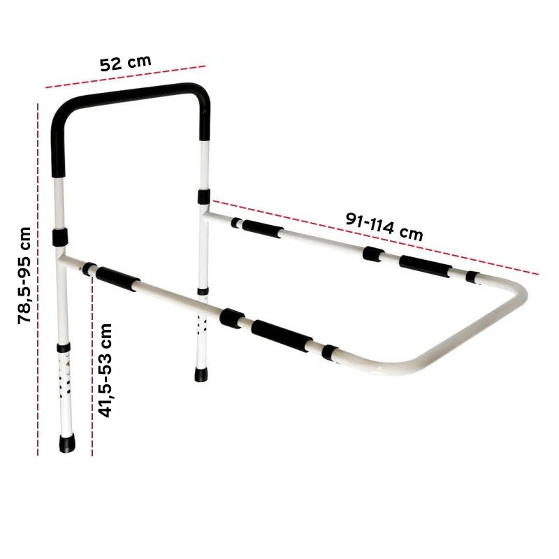 Stabiele bedhekje met vloersteun, die het gemakkelijker maakt om in en uit bed te stappen. Het bedhekje biedt ondersteuning en veiligheid in en rondom het bed, en voorkomt dat de gebruiker uit het bed kan vallen. Het frame zelf is verstelbaar en kan overal onder de matras worden geplaatst.