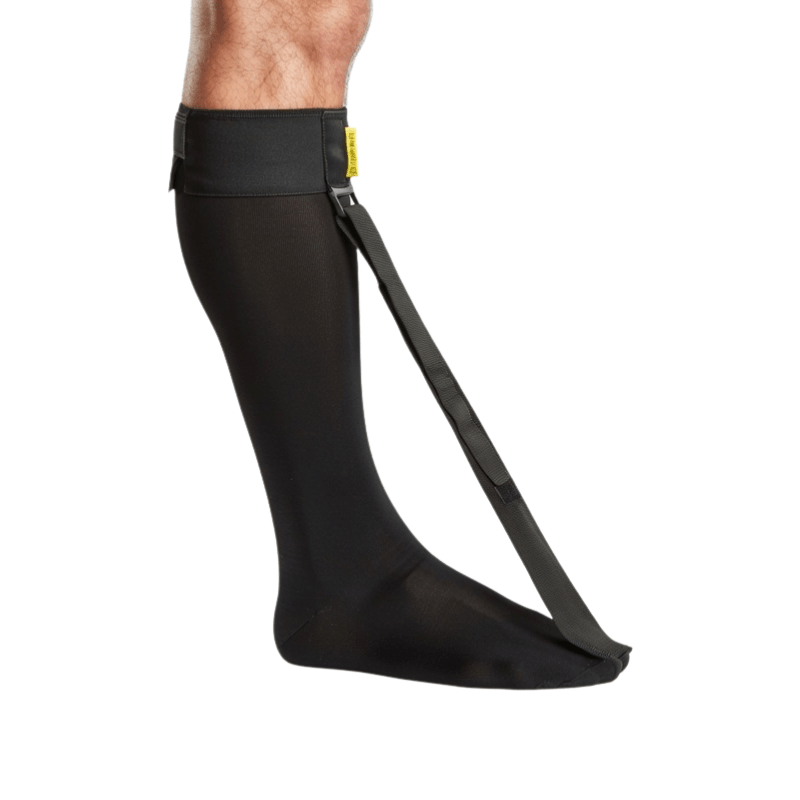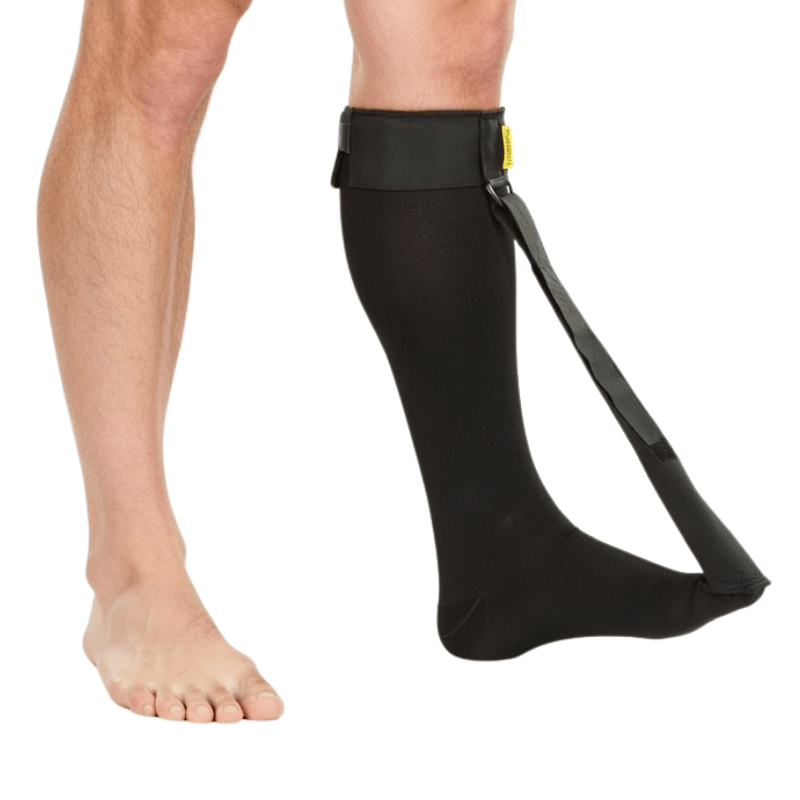 Flexibele zwarte Strassburg sok, die 's nachts wordt gebruikt voor de behandeling van ontsteking van de peesaanhechting of hielspoor. De sok werkt door de fascia plantaris te strekken, wat zorgt voor het behouden van de genezing die 's nachts plaatsvindt.