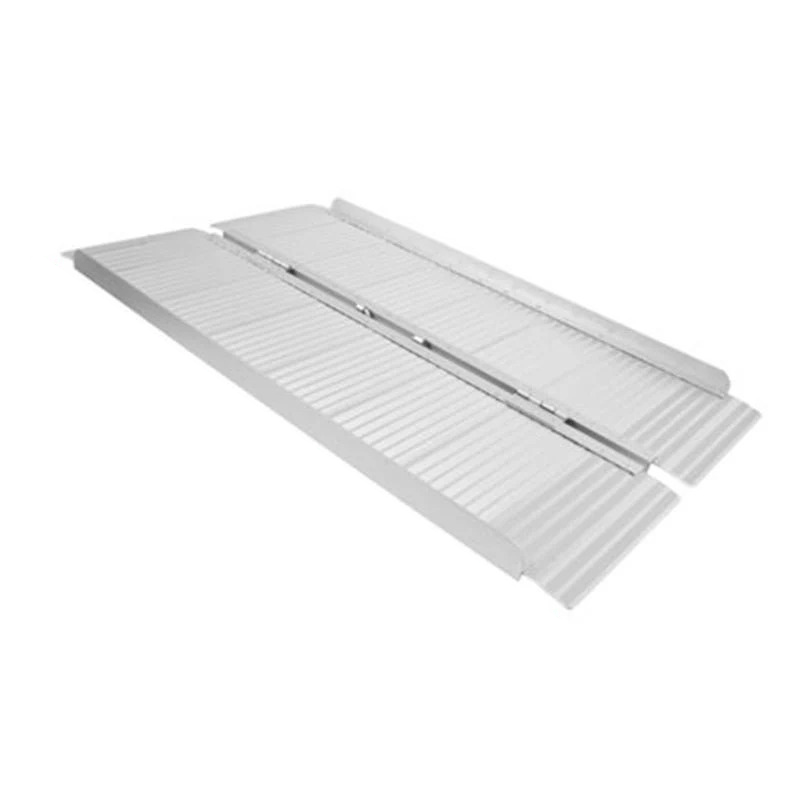 Rampe aus Aluminium mit geriffelter Oberfläche und Tragegriff. Die Rampe ist längs faltbar, sodass sie leicht zu bewegen und zu transportieren ist.