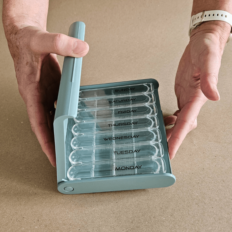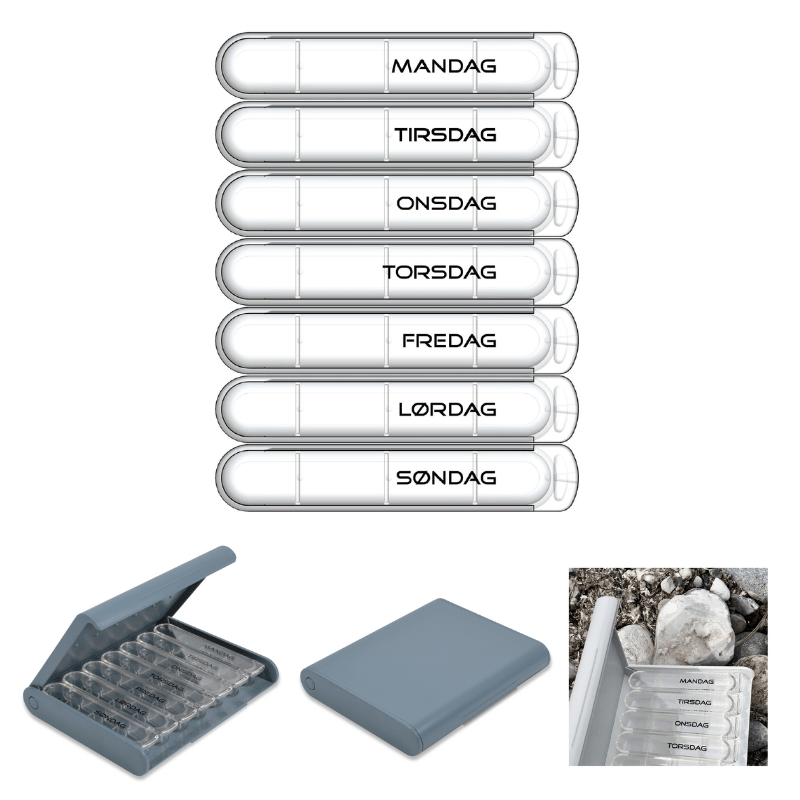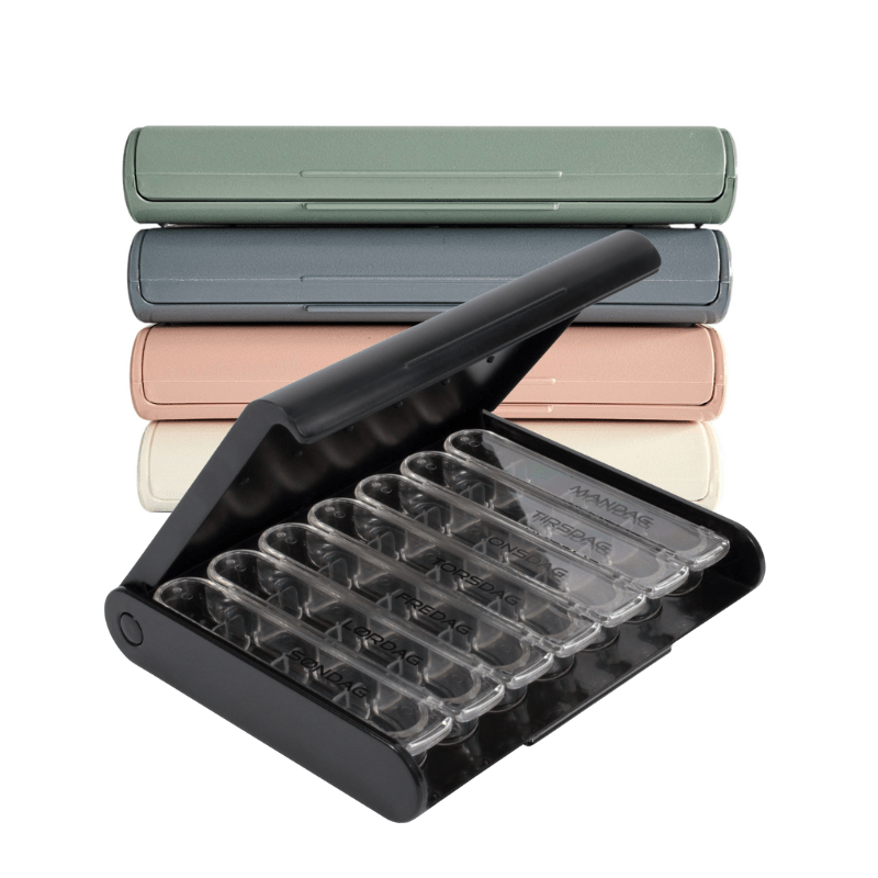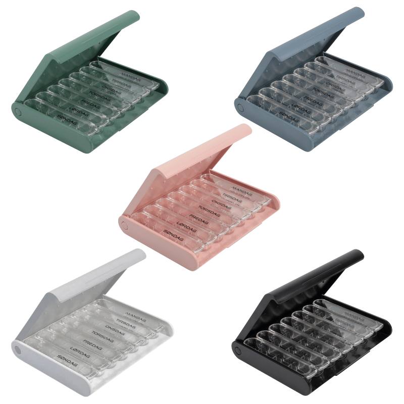 Elegante Pillenbox in modernen Farben – schlicht, praktisch und typisch dänisch im Design. Sieben separate Dosiereinsätze, einer für jeden Wochentag, helfen dir zuverlässig beim Organisieren deiner Tabletten. Jeder Einsatz ist in 4 Fächer unterteilt, sodass du bis zu 4 Einnahmezeiten täglich planen kannst.