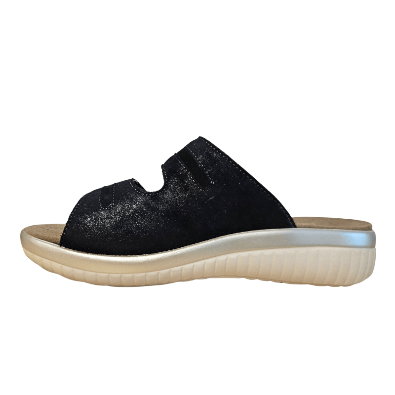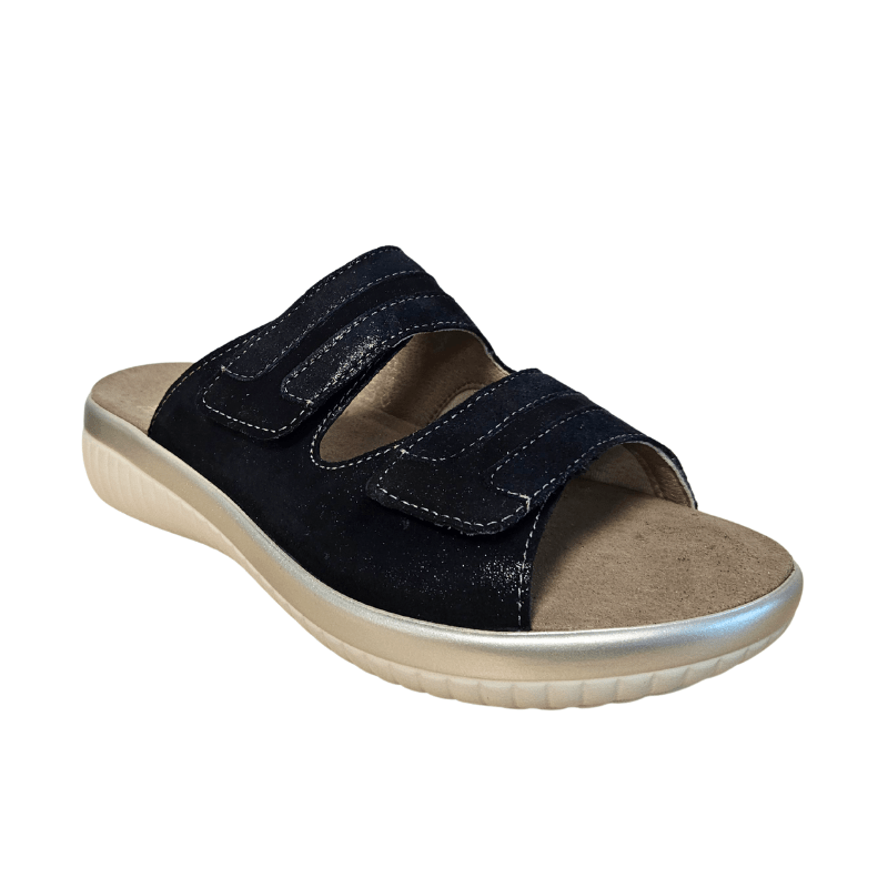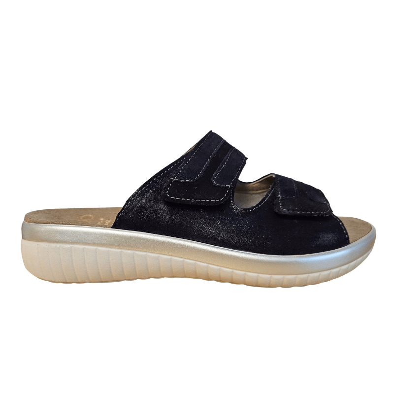 Bequeme Damensandale mit weichem und flexiblem Obermaterial aus schwarzem Veloursleder sowie einer weißen Sohle mit einem eleganten Silberstreifen-Detail. Dank der zwei verstellbaren Klettverschlüsse über dem Spann lässt sich die Passform einfach anpassen.