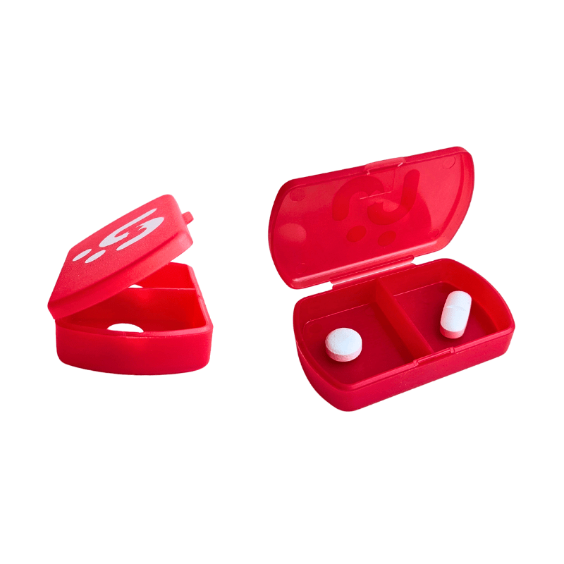 Diese praktische Pillendose mit zwei getrennten Fächern in einem frischen Rotton ist sowohl funktionell als auch kompakt. Mit ihrer Größe von 6 x 4 cm passt sie problemlos in deine Tasche, Handtasche oder Kulturbeutel - ideal für den Alltag oder auf Reisen.