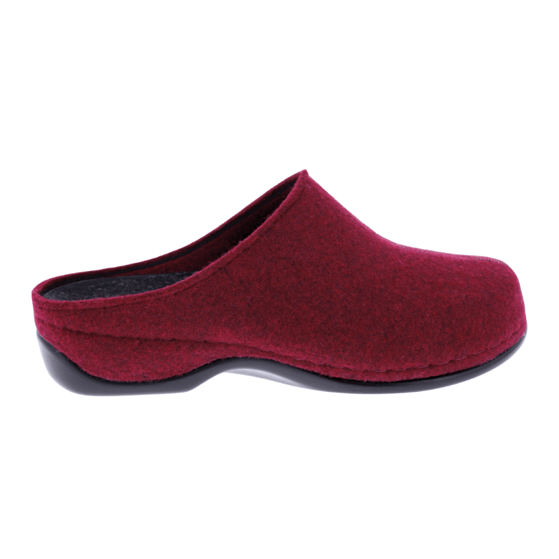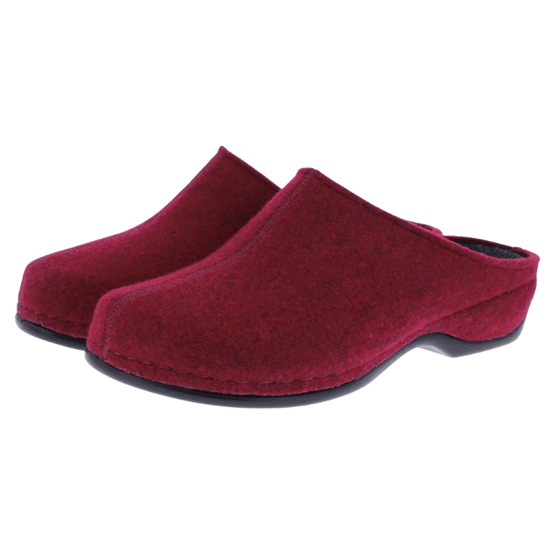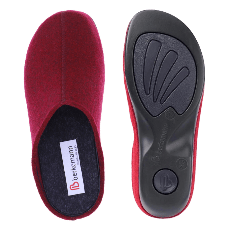 Comfortabele pantoffel van Berkemann in donkerrood vilt, die warmte en comfort biedt op koude dagen. Het zachte viltmateriaal vormt zich naar de voet en zorgt voor een lichte en flexibele pasvorm.